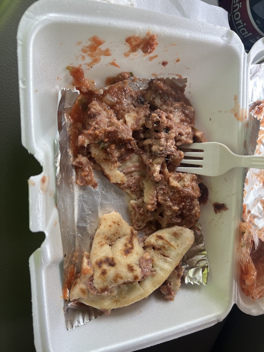 I tried pupusas, carne asada and pollo guisado (with smoothies). All of them were good but the pupusas were delicious!! They have a bakery and cake section, too! Good place to eat there with your friends, partner, or family. Everyone wear mask.